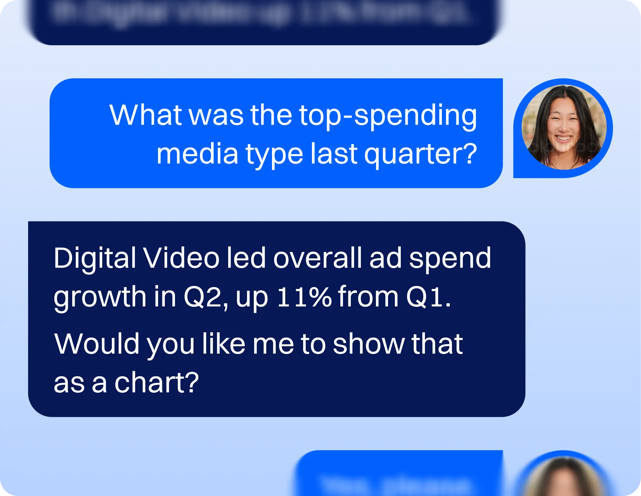 Chat directly with the AI Agent, reset conversations, expand or edit visuals, and share feedback to improve results.